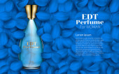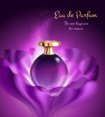 Różowe perfumy w złotym sprayu przezroczyste szkło butelka realistyczny plakat reklamowy z czarnym pinc tło wektor ilustracja