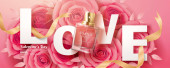 Spray butelki izolowane na tle płatków czerwonej róży. Premium reklamy strona internetowa marketing social network blog. Realistyczna butelka perfum 3D. Na plakat szablon plakat plakat plakat plakat plakat okładka tapety