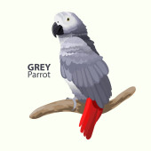 Afrykańska szara papuga w kreskówkowym stylu na białym tle. Psittacus erithacus.