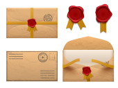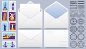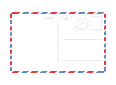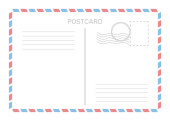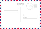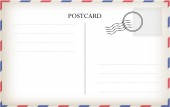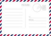 Szablon pocztówki. Papierowa kartka pocztowa z tyłu ze znaczkiem i ramką w paski. Puste vintage mail biały list na makietę wektora wiadomości