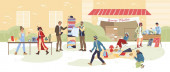Nocny rynek. Ludzie na letnim jarmarku. Sklep festiwalowy, stoisko, kwiat, odzież i sklep kosmetyczny rzemieślniczy. Baner wektorowy wydarzenia miejskiego
