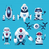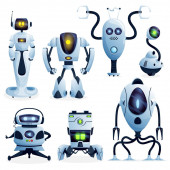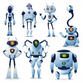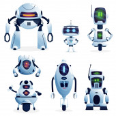 Zdjęcie "Bohaterowie kreskówek robotów z wektorem ai lub sztucznej inteligencji maszyny robotyczne. Nowoczesne białe roboty, zabawki, humanoidalne androidy i czaty z ładnymi ekranami twarzy, antenami i manipulatorami" może być wykorzystywane do celów osobistych i komercyjnych zgodnie z warunkami zakupionej licencji Royalty-free. Obraz jest dostępny do pobrania w jakości wysokiej rozdzielczości do 5760x3840.