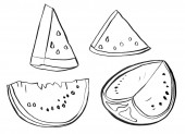 Świeże soczyste plastry, części owoców arbuza w ręcznie rysowane doodle stylu. Zestaw ilustracji wektorowych izolowanych na białym tle.