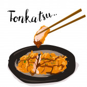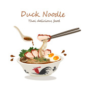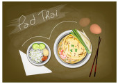 Tajski makaron z wieprzowiną, kulą wieprzową, chrupiącą wieprzowiną i zupą z krwi w tradycyjnej miseczce na drewnianym stole i czarnym tle. Ilustracja wektora dla projektu lub wzoru.