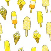 Lody cytrynowe z klinami cytrynowymi. Kontekst. Wielokolorowy obraz w stylu szkicowym. Element do projektowania. Ilustracja wektora.