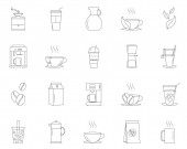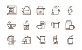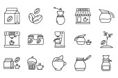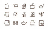 Zestaw ikon do kawy. Kawa na wynos, młyn, kroplówka, cezwa, trawka, fasola, kapsułki i drzewo. Koncepcja restauracji annd sklepów internetowych. Edytowalne pociągnięcia.