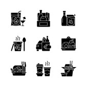 Jedzenie na wynos i opcja dostawy czarne ikony glifów ustawione na białej przestrzeni. Miska owsianki. Czerwone i białe wino. Butelka z wodą z owocami. Świeży chleb. Symbole sylwetki. Ilustracja izolowana wektora
