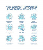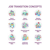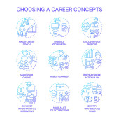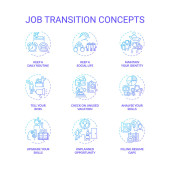 Zdjęcie "Ikony koncepcji przejścia na pracę ustawione. Doradztwo zawodowe pomysł cienka linia RGB kolorowe ilustracje. Jak odnieść sukces. Popraw swoje umiejętności. Rysunki zarysu izolowanego wektora. Udar edytowalny" może być wykorzystywane do celów osobistych i komercyjnych zgodnie z warunkami zakupionej licencji Royalty-free. Obraz jest dostępny do pobrania w jakości wysokiej rozdzielczości do 5760x3840.