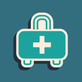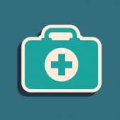 Zielony zestaw pierwszej pomocy ikona izolowana na zielonym tle. Skrzynka medyczna z krzyżem. Sprzęt medyczny na wszelki wypadek. Koncepcja opieki zdrowotnej. Długi styl cienia. Wektor