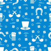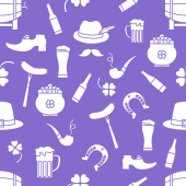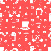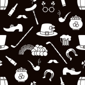 Irish Vector bezszwowy wzór Happy St. Patrick 's Day Ilustracja Shamrock Horseshoe Palenie fajki Piwo Buty krasnala Kiełbasa Dzbanek złota Tęcza Wąsy Kapelusz, laski Holiday Party Uroczysty