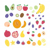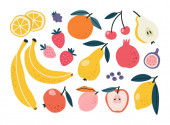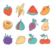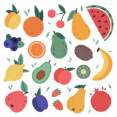 Zestaw prostych ręcznie rysowane owoce doodle i jagody izolowane na białym odizolowanym tle. Nowoczesny styl prosty płaski wektor ilustracja