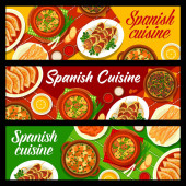 Hiszpańska kuchnia wektorowe banery zupa migdałowa ajo blanco, czosnek cytrynowy kurczaka lub pikantne ziemniaki tapas patatas bravas. Makaron z owoców morza, bekon i kiełbasa chorizo tapas migas, duszony królik Hiszpania jedzenie