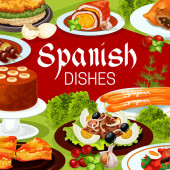 Zdjęcie "Hiszpańska kuchnia wektorowe banery zupa migdałowa ajo blanco, czosnek cytrynowy kurczaka lub pikantne ziemniaki tapas patatas bravas. Makaron z owoców morza, bekon i kiełbasa chorizo tapas migas, duszony królik Hiszpania jedzenie" może być wykorzystywane do celów osobistych i komercyjnych zgodnie z warunkami zakupionej licencji Royalty-free. Obraz jest dostępny do pobrania w jakości wysokiej rozdzielczości do 5760x3840.