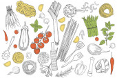 Ręcznie rysowane warzywa na patelni na białym tle. Ilustracja szkicu wektora.