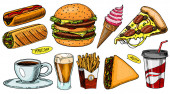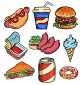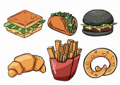 Zestaw ikon fast foodów. Posiłki, niezdrowe jedzenie, niezdrowe jedzenie. Koncepcja jedzenia. Na takie tematy jak dostawa, posiłek, kawiarnia. Ilustracja wektora