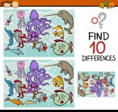 Znajdź 10 różnic. Gra edukacyjna dla dzieci. Dziewczyna w masce i płetwach pływa z rybami w niebieskim tle
