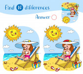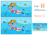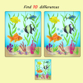Znajdź 10 różnic. Gra edukacyjna dla dzieci. Podwodne życie. Wielokolorowe ryby pływają na tle korali. Na dnie leży rozgwiazda i krab..
