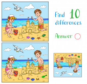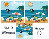 Znajdź 10 różnic. Gra edukacyjna dla dzieci. Dziewczyna w kostiumie kąpielowym siedzi na leżaku i smaruje się kremem do opalania, słońce nad morzem uśmiecha się i patrzy na nią..