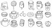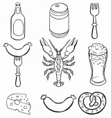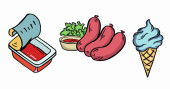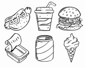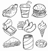 Amerykańskie jedzenie, japońskie jedzenie, owoce morza, przekąski i zestaw nakryć do stołu. Tło do drukowania, projektowania, sieci. Nadaje się jako ikony. Płynnie. Kolor binarny.