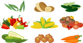 Jagody, warzywa i owoce. Cartoon acai, jagoda i guarana, kakao, kiwi i quinoa, chia, fasola i physalis, goji, mięso łososia i kapusta jarmużowa, spirulina, słodkie nasiona ziemniaków i konopi