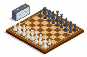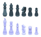 Izometryczny zestaw standardowych figurek szachowych. Ikony szachowe. Gra planszowa. Szachista, lub szachista, jest jednym z sześciu rodzajów ruchomych przedmiotów używanych na szachownicy do gry w szachy.
