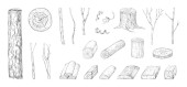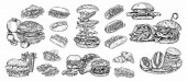 Ręcznie rysowane produkty mięsne. Części wieprzowiny i wołowiny, kawałki z kośćmi lub filetami. Wędzony kurczak. Kiełbaski i szynka. Menu sklepu mięsnego. Składniki gotowania. Monochromatyczny zestaw żywności wektorowej