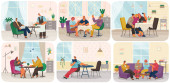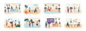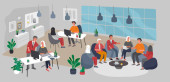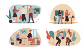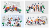 Praca w biurze z pracownikami grupy komunikującymi się lub rozmawiającymi z klientem lub rozmowy między pracą zespołową lub spotkaniem, burza mózgów. Wektor kreskówki koncepcja ilustracja