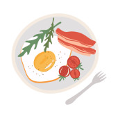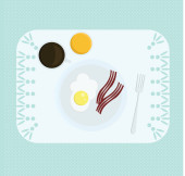 Śniadanie z jajecznicą, bekonem, rukolą, naleśnikami, miodem i kawą