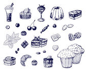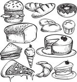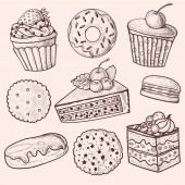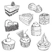 Kolekcja plasterków ciasta izolowana na białym tle. Wektor ręcznie rysowane szkic ilustracji. Ikony deserów i zestaw elementów do projektowania kawiarni. Słodkie ciasto, sernik, budyń chia, makarony, placek cytrynowy