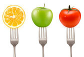 Panorama świeżych owoców i warzyw w rzędzie z refleksją. Arbuz, kokos, melon miodowy, brzoskwinia, gruszka, grejpfrut, kiwi, dynia, pomarańcza, śliwka. Wektor.