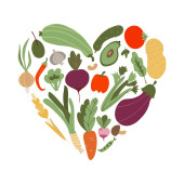ilustracja na temat zdrowego odżywiania, wegetarianizmu. warzywa, żywność pochodzenia roślinnego w kształcie serca wyizolowanego na białym tle. kampania na rzecz zdrowego stylu życia. Płasko. Ilustracja wektora akcji. EPS 10