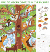 Urodziny psa. Znajdź 10 ukrytych przedmiotów na zdjęciu. Puzzle ukryte przedmioty. Zabawna postać z kreskówki