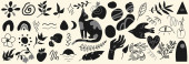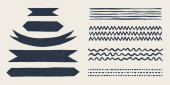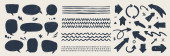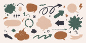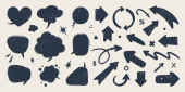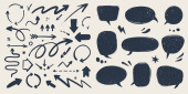Streszczenie strzałek i bańki mowy ustawione. Różne strzałki doodle i rozmawiać balony z grunge tekstury. Ręcznie rysowana abstrakcyjna kolekcja infografik wektorowych vintage.