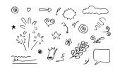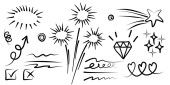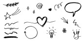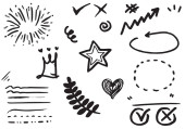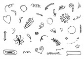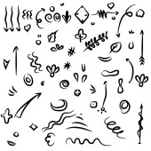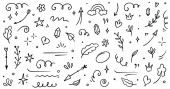 ręcznie rysowany zestaw kręconych kołysek, kołysek, kołysek. Streszczenie strzałki, Strzałka, serce, miłość, gwiazda, liść, słońce, światło, korona, król, królowa, na stylu doodle koncepcji projektowania. ilustracja wektora.
