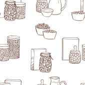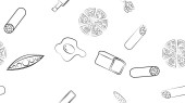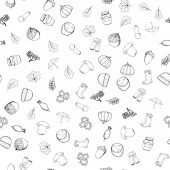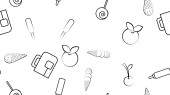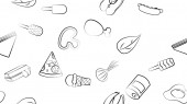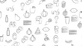 Czarno-biały niekończący się wzór żywności i przekąsek ikony zestaw dla restauracji bar kawiarnia: kiełbasy, soda, kiełbasa, jajko, czosnek, mleko, truskawka. Kontekst.