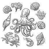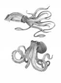Ośmiornice macki i ręcznie rysowane kałamarnice na ilustracji wektora, kuchnia śródziemnomorska