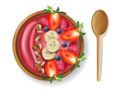 Kiwi bowl wektor realistyczny makieta. Świeże śniadanie z owocami truskawek. Zdrowa dieta. Umieszczanie produktów