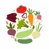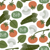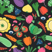 Płynny wzór z kreskówki warzywa, elementy dekoracyjne. Kolorowy wektor. rysunek dłoni, płaski styl. projekt tkaniny, nadruku, tekstyliów, opakowania