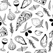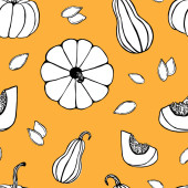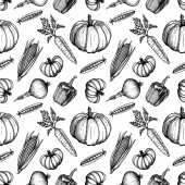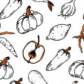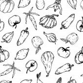 Owoce i warzywa płynny wzór. Ręcznie rysowane jedzenie. Czarno-białe bazgroły z kolorowym abstrakcyjnym miejscu. Wegetariański skecz o jedzeniu. Linia sztuki gruszki, dyni, cytryny, pomidora, jabłka. Zarys upraw.