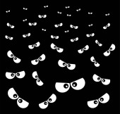 Kreskówkowe przerażające oczy w ciemności. Oczy na Halloween. Płaski wektorowy potwór, straszny piktogram. Oczy błyszczą w ciemności,