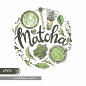 Ręcznie rysowane szkice różnych napojów matcha i gotowania, ilustracja wektor.