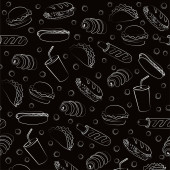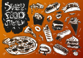 Ręcznie rysowane wektor linii ilustracji na białym tle. Kolekcja Doodle street fast food menu: hamburger rzemieślniczy, tortilla, pizza pepperoni, francuski, kliny ziemniaczane, napój gazowany, sos, hot-dog
