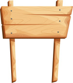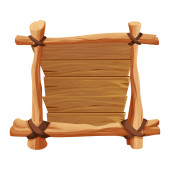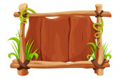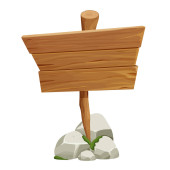 Drewniany wskaźnik, szyld z kamieniem, stos kamienia i mech w stylu kreskówki izolowane na białym tle. Aktywa Ui, element projektu. Stara gałąź drzewa teksturowana z deską.