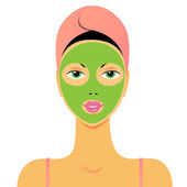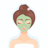 Dziewczyna w ręczniku nałożyła nawilżającą zieloną maskę na twarz. Pielęgnacja twarzy. Wektor płaska ilustracja na białym tle