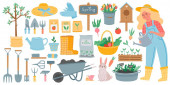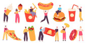 Malutcy ludzie ze zdrowym jedzeniem. Mężczyzna i kobieta noszą warzywa i owoce. Organiczny świeży produkt wegański gospodarstwa. Cartoon wegetariański zestaw wektorowy diety