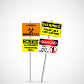 obraz różne niebezpieczeństwa i ostrożnie znaki na tle ogrodzenia ogniwo łańcucha.