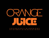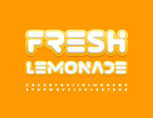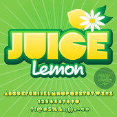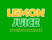 Wektor twórczy znak Lemon Juice. Jasne żółte czcionki. Odręczny zestaw liter i liczb alfabetu