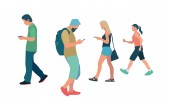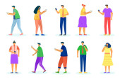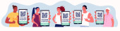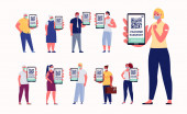 Ludzie w maskach medycznych zapobiegają rozprzestrzenianiu się infekcji. Szczepienie zapobiegawcze przeciwko koronawirusowi. Studenci, biznesmeni, mężczyźni i kobiety z cyfrowymi certyfikatami, kod QR na telefonie. Wektor.