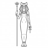 Animacja portret Starożytna egipska bogini Bastet (Bast) posiada symbole władzy: laskę i krzyż. Święta kota. Widok profilu. Ilustracja wektora odizolowana na białym tle. Druk, plakat