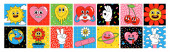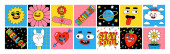 Naklejki z zabawnymi postaciami z kreskówek. Wektorowa ilustracja komiksowego serca, słońca, planety, jagód, abstrakcyjnych twarzy itp..